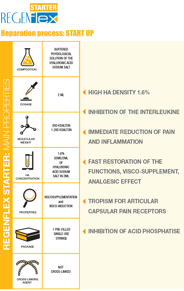 REGENFLEX® STARTER is injectable products based on a buffered physiological solution (respectively 1,6% and 0,8%) of hyaluronic acid sodium salt with significant viscoelastic properties.